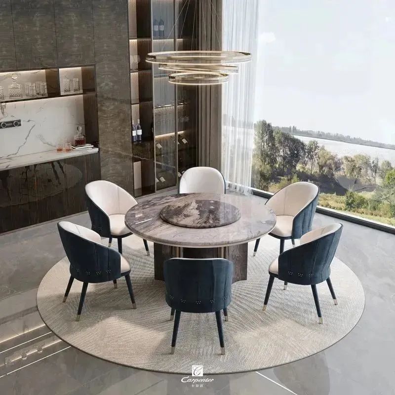 設計師通過材質選擇、色彩運用和軟裝搭配,演繹高級輕奢風。注重空間與功能的結合,餐邊柜、酒柜及餐桌椅井然有序、整齊劃一,滿足用餐、收納、展示等多重需求。